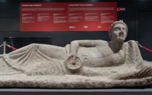 Si tratta di due urne cinerarie in travertino provenienti da Perugia e di un coperchio di sarcofago da Tuscania, che catturano l’attenzione grazie ai ritratti idealizzati di Laris Afle, Arnth Acsi e Larth Cales, uomini, probabilmente aristocratici, vissuti nel II secolo a.C. Tutti e tre i personaggi sono raffigurati sdraiati, mentre partecipano a un simposio: un ricevimento in cui si beveva, conversava ed ascoltava musica, un momento fondante della vita sociale degli Etruschi.