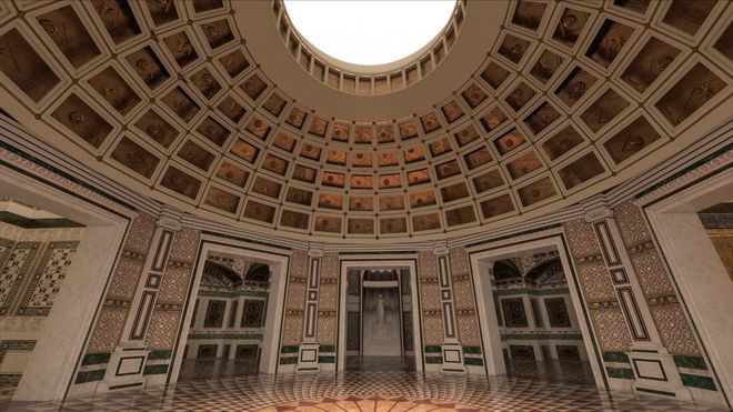 Ma la storia raccontata dai segni della sala ottagona non si ferma qui. Aggiunge Alessandro D’Alessio: “A questo punto, restava da comprendere la funzione dei numerosi fori di chiodi presenti sempre nella parte interna della cupola. Ci siamo accorti del fatto che erano disposti lungo cinque circonferenze parallele che sezionano la volta, risparmiando solo la zona dell’oculo centrale. Secondo la nostra ricostruzione, si trattava di punti su cui ancorare pannelli, per esempio in bronzo dorato e decorati, organizzati in almeno cinque file, e visibili perché la controcalotta rotante non era da immaginarsi come compatta, ma strutturata in forma di griglia aperta con almeno cinque ordini di riquadri. La struttura della cassettonatura è molto simile a quella visibile, per esempio, nel cosiddetto Lupercale del Palatino o, come esempio famosissimo, nella cupola del Pantheon”.