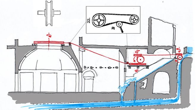 Ma quale forza motrice garantiva il movimento ininterrotto? Continua l’archeologo: “Gli architetti della Domus Aurea, Severo e Celere, erano con ogni probabilità di formazione, se non di origine, alessandrina, come attestato anche da testimonianze papirologiche. La tradizione ingegneristica egiziana era famosa per la produzione di marchingegni a movimento automatico. Con l’aiuto del Dipartimento di ingegneria meccanica, energetica e gestionale dell’Università della Calabria, si è potuto ipotizzare il meccanismo idraulico attraverso cui il soffitto poteva ruotare, con un effetto analogo a quello descritto da Svetonio. Gli scavi archeologici di Laura Fabbrini avevano già messo in luce la presenza di strutture per il trasporto dell’acqua sopra la sala ottagona, agevolmente utilizzabili, oltre che per i giochi decorativi, anche per alimentare questo meccanismo, per il quale possono essere ipotizzate più soluzioni plausibili”.