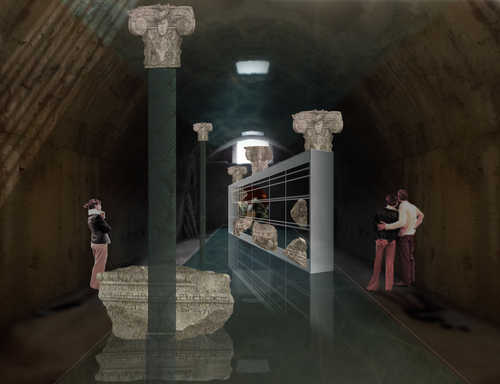L’allestimento dell’insieme dei reperti è collocato su pedane ricoperte con una finitura verde-azzurro a suggerire l’idea dell’acqua e, con essa, l’ambientazione originaria dei marmi. Per l’apertura dei sotterranei si è anche provveduto all’impermeabilizzazione delle volte che coprono le ampie gallerie e all’illuminazione degli ambienti facendo particolare attenzione ad esaltare i marmi esposti. Il percorso espositivo si articola lungo due gallerie parallele, che dalle scale d’accesso conduce prima alle due isole espositive dedicate alle palestre, poi a quella del frigidarium, per proseguire nella seconda galleria che contiene le isole della natatio e delle biblioteche.