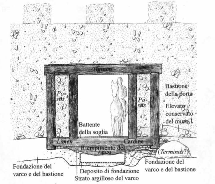 L’area così delimitata da quattro vertici sarebbe stata identificata come , realizzata da Romolo stesso con l’uso dell’aratro. La tradizione conserva, inoltre, anche il nome di alcune porte più antiche: ( ), verso il Foro, , verso la Velia, e .