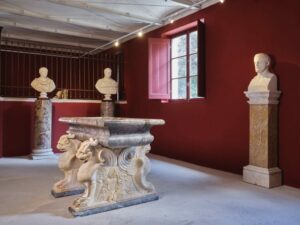 Un’opera di particolare interesse è una straordinaria Vasca in marmo africano, posta in dialogo con il bassorilievo raffigurante una copia dell’Eros su biga, che esalta la ricchezza decorativa e la raffinatezza artistica delle sculture esposte.