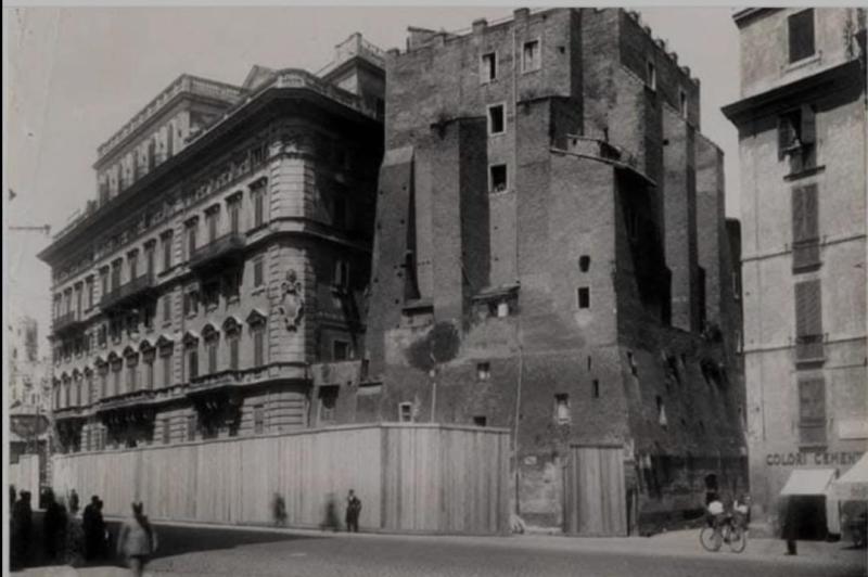Così è in stato di abbandono quando, con la terza Roma, la Torre viene acquisita, col terreno attorno, dalla famiglia Nicolini che nel 1884 costruisce il suo palazzo affacciato sul Foro Romano, al termine di via Cavour: si libera il terreno da quanto lo ingombra e si tenta di demolire anche la torre. Ma l’ingegnere Francesco Mora non ci riesce (dopo non sappiamo quali e quanti tentativi). Quando fra il 1932 e il 1934 il Palazzo Nicolini, ancora quasi nuovo (per un edificio mezzo secolo è un tempo breve), viene demolito per fare largo alla nuova via denominata dei Monti (in riferimento non al rione ma ai Monti Tuscolani e in alternativa alla via del Mare), poi dell’Impero, quindi dei Fori Imperiali, proprio allo snodo con via Cavour, la Torre viene nuovamente risparmiata. Ma delle modalità delle adiacenti demolizioni dell’edificio Nicolini, contiguo, sorto quasi in aderenza, sempre poco o nulla sappiamo.