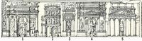 In una seconda lastra vengono rappresentati i monumenti alla cui costruzione sicuramente partecipò il proprietario della tomba, Q. Haterius Tychius. Si possono riconoscere un arco dedicato ad Iside e Serapide (1), il Colosseo (2), l’arco d’accesso al Circo Massimo (3), l’arco di Tito sulla via Sacra (4) ed un tempio esastilo.Escludendo quindi la cattiva opinione che gli antichi romani avevano nei confronti degli artigiani, certamente a Roma se non si può parlare propriamente di rivoluzione, poco ci manca.