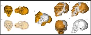 – Ricostruzione virtuale del cranio di Altamura (in ocra) mediante tecniche di paleoantropologia virtuale; il reperto di confronto in grigio (g) è il Cranio 5 di Atapuerca-SH.
