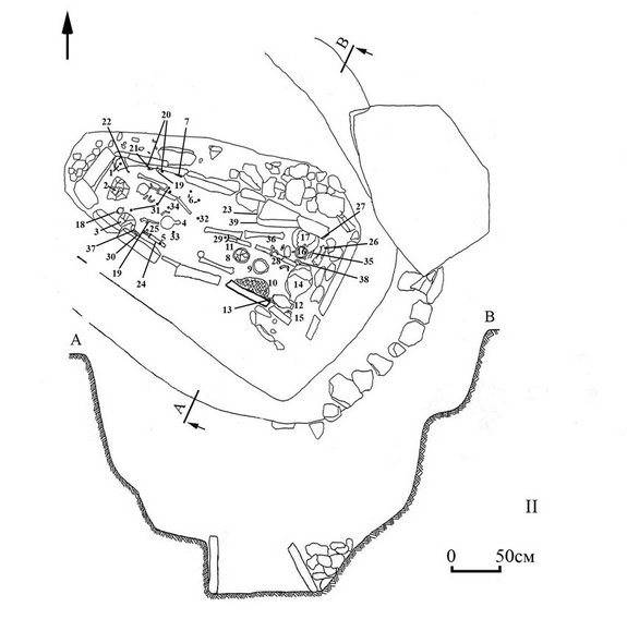 Il guerriero venne sepolto con una dozzina di oggetti d’oro, un’ascia, una cotta di maglia e due spade di ferro (una, posta tra le due gambe, lunga 91 cm). Vicino a lui vi erano anche i resti di tre cavalli, una mucca e un cinghiale – “un segno della grande importanza della persona”, scrive Mordvintseva.