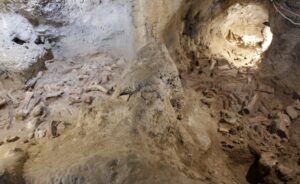 La caratteristica di questo luogo è quella di permettere un vero e proprio viaggio nel tempo: le condizioni di oggi sono sostanzialmente le stesse di 50 mila anni fa e la presenza di fossili rende la grotta un’eccezionale banca dati. I recenti scavi hanno restituito migliaia di reperti ossei animali che arricchiscono la ricostruzione del quadro faunistico, ambientale e climatico. Sono stati determinati oltre ad abbondanti resti di iena, diversi gruppi di mammiferi di grande taglia tra cui: l’uro, il grande bovino estinto, che risulta una delle specie prevalenti insieme al cervo nobile; ma anche i resti di rinoceronte, di elefante, del cervo gigante (Megaloceros), dell’orso delle caverne, e di cavalli selvatici. La presenza di queste specie si accorda bene con l’età di circa 50 mila anni fa, quando la iena trascinava le prede nella tana usando la grotta come riparo e deposito di cibo. Molte delle ossa rinvenute mostrano infatti chiari segni di rosicchiamento.