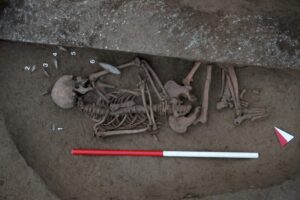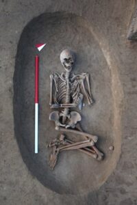 All’interno, gli studiosi hanno trovato degli scheletri: due sono ottimamente conservati, mentre uno è in condizioni di maggiore degrado. Entrambi mostrano una postura leggermente rannicchiata e le tumulazioni sono corredate da punte di freccia e da un pugnale: si può quindi pensare che si trattasse di cacciatori. Per la precisione, uno dei due scheletri rinvenuti «regge» l’arma in una mano, mentre sul gomito opposto gli venne poggiata la punta di una freccia.