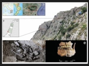 Immagine: Da: Fontani, F., Boano, R., Cinti, A. et al. “Sci Rep” 13, 11978 (2023). (a) Localizzazione di San Lorenzo Bellizzi.; (b) Massiccio di Pietra Sant’Angelo e, nel cerchio, l’ingresso dell’omonima grotta; (c) planimetria della grotta e localizzazione della sepoltura (cerchio rosso), con ampiezza degli scavi indicata in verde; (d) scheletro dell’individuo; (e) mandibola intatta dello stesso – Foto “b” e “d” di Felice Larocca, foto “e” di Alessandra Cinti.