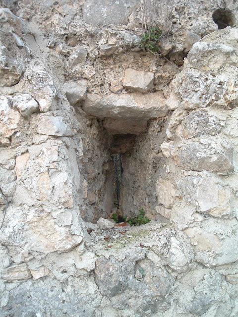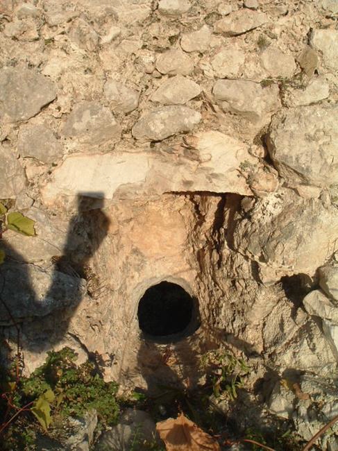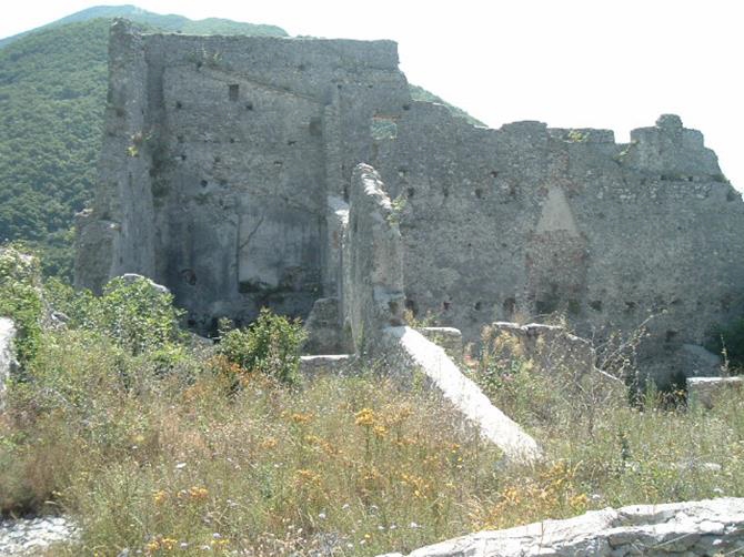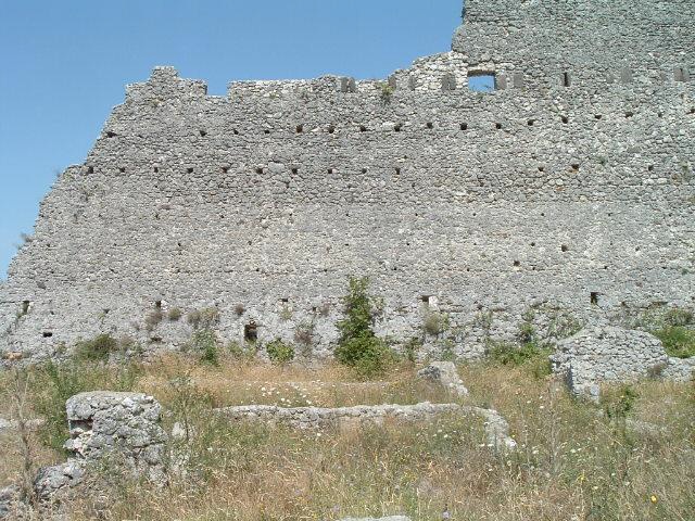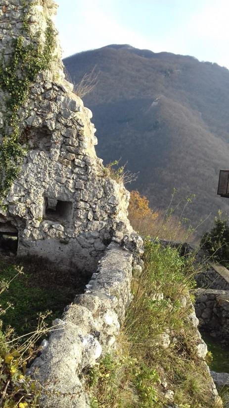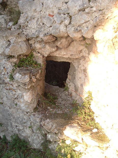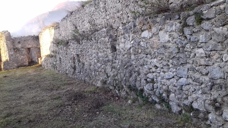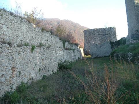 laterale. La cinta inoltre presenta anche delle feritoie basse più vicine alla quota del piano di campagna, di forma quadrangolare svasata internamente. Dall’analisi della cortina appare che a meno di due metri dal piano di campagna verso l’interno vi fosse una balconata, che poggiava in parte sulla struttura muraria su cui è ricavato una sorta di gradino di appoggio ben visibile.