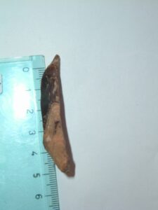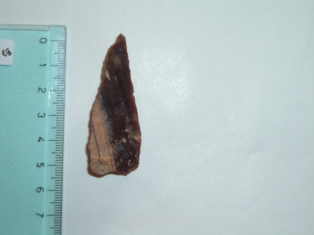 La punta è un elemento in selce scura (nero) spuria ben conservata, dimensioni di 5,5 centimetri di lunghezza per 1,5 centimetri di larghezza per circa 1,0 centimetri nel punto di massimo spessore. Si presenta quale punta a dorso bilaterale e convesso con la faccia superiore lavorata per scheggiatura, mentre l’inferiore è piatta; il manufatto è confrontabile con il sistema tipologico di Laplace e rientrante nella classe delle punte a dorso totale tipo PD4. Presumibilmente ascrivibile al Paleolitico superiore, per la tipologia potrebbe essere collocato in un periodo temporale tra i 20.000 ed i 30.000 anni, volendo essere cauti potrebbe essere collocato a 20.000 anni dal presente.