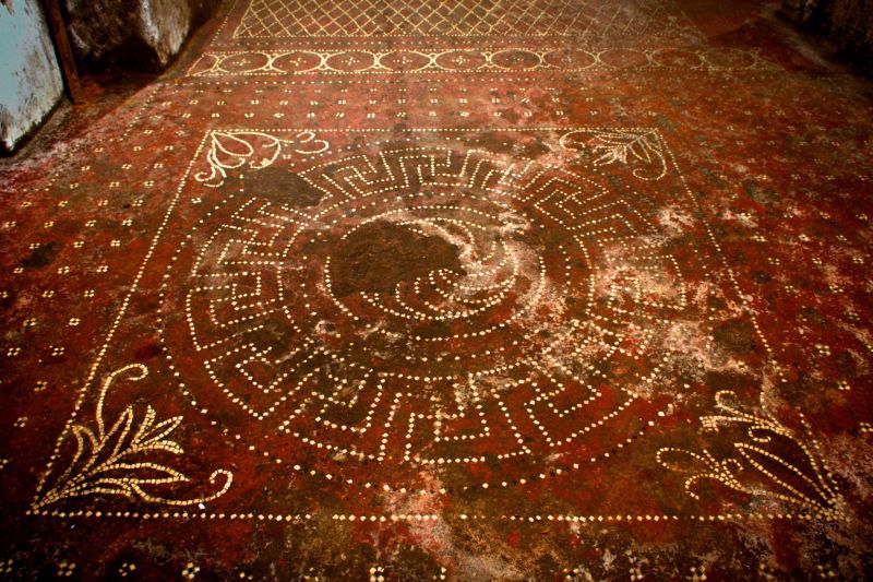 Colpisce immediatamente la ricchezza dell’apparato decorativo, con le pareti e le volte affrescate secondo i moduli del I stile (sebbene di ciò restino poche tracce, a causa dei danni provocati dai lavori moderni), mentre impressionanti sono le decorazioni musive del pavimento: su un fondo in cocciopesto dal colore rossastro si innestano mosaici con tessere bianche e nere a comporre variegati motivi geometrici (rombi, esagoni, crocette, meandri, quadrati) e floreali.
