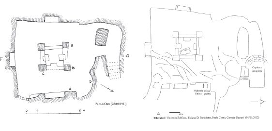 L’attività erosiva e carsica che contraddistingue l’altopiano ibleo, nella cuspide sud-orientale della Sicilia, ha determinato la formazione di enormi cavità naturali che la popolazione locale ha ampiamente utilizzato, dalla Preistoria sino a tempi più recenti, sia come ripari provvisori o dimore permanenti, che come sepolcreti ove deporre i propri defunti e luoghi dedicati ai culti ed ai riti sacri1. Nelle numerose balze, che conferiscono all’intero paesaggio ibleo un particolare e caratteristico aspetto aspro e tormentato, alle molteplici aree cimiteriali protostoriche a grotticella artificiale, inoltre, si sovrappongono spesso, senza soluzione di continuità, le necropoli ipogeiche paleocristiane e gli abitati rupestri di età medievale, dando vita ad un vero e proprio palinsesto in negativo di momenti storici e culturali diversificati nel tempo, che la tradizione erudita e antiquaria ha spesso percepito come un fenomeno unitario, astorico e relativo ad un mondo primitivo e selvaggio (“trogloditismo”).