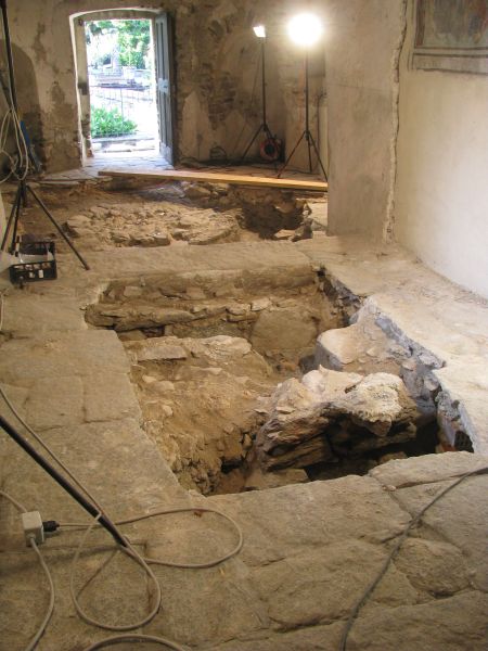 Nel corso dell’intervento di scavo all’interno del battistero di San Giovanni Battista, concordemente datato intorno alla metà del IX secolo, sono emerse evidenze relative ad un edificio precedente che hanno imposto l’indagine integrale del vano. Gli scavi archeologici, ancora in corso sotto la direzione scientifica della Soprintendenza per i Beni Archeologici del Piemonte e del Museo Antichità Egizie, stanno rivelando l’esistenza di un edificio battesimale, la cui datazione è al momento oggetto di approfondimenti, precedente a quello esistente in elevato. Solo il completamento delle indagini archeologiche e lo studio integrale dei reperti rinvenuti durante lo scavo permetteranno la definizione puntuale della planimetria del complesso più antico e della cronologia dello stesso.