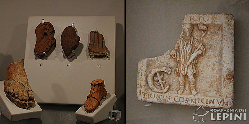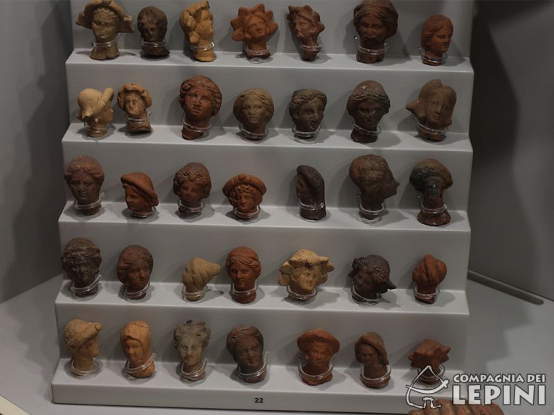 Anche i contesti funerari di età storica forniscono significativi dati sui nostri predecessori: gli oggetti che accompagnavano il defunto nel suo viaggio nell’aldilà, come quelli del corredo di un guerriero (VII sec. a.C.) rinvenuto in località Fontanelle (sala IV), raccontano la storia di chi li aveva utilizzati in vita. Iscrizioni, ritratti e decorazioni varie (sala V) avevano la funzione di conservare la memoria del defunto affinché i vivi ricordandolo potessero imitarne vita e gesta (Petronio, Satyricon). Così un certo Victor, membro del collegio dei suonatori di tromba e corno, è rappresentato insieme ai suoi strumenti musicali in un piccolo altorilievo marmoreo. Molte le analogie che legano il mondo dei riti funerari a quello dei culti, sia per gli impliciti contenuti religiosi, sia perché entrambi rivelano interessanti risvolti sociali, economici e politici. Le numerose terrecotte votive, raffiguranti statuette, teste, mezze teste, maschere, parti anatomiche e animali, rinvenuti nell’area del santuario suburbano di Crocevecchia (fine del IV e il II sec. a.C.), testimoniano non solo la venerazione di una divinità legata alla sanatio, ma soprattutto evidenziano le particolari esigenze di salute e prosperità dei fedeli (sala VI).