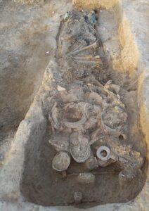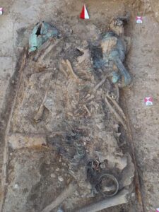 Gli scavi hanno portato alla luce una sepoltura a inumazione della seconda metà del VI sec. a.C. circa che ospita un guerriero armato di elmo, lancia, spada lunga, pugnale (con il suo fodero) e ascia, sepolto assieme a un ricco corredo ceramico e bronzeo, oltre alle caratteristiche fibule (in bronzo, ambra e osso) collocate sul petto.