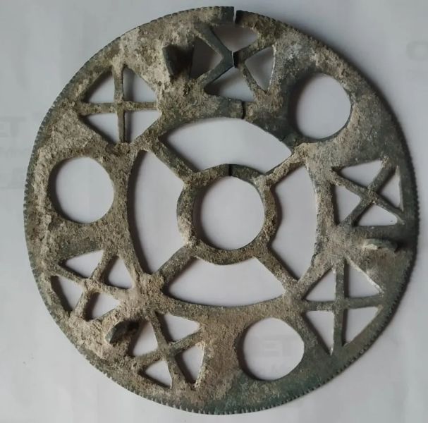 Il manufatto presenta una corona circolare collegata ad un nucleo centrale più piccolo tramite quattro barre radianti; elementi cruciformi separano i tre alloggiamenti esterni. In origine era sospeso mediante catenelle, dettaglio che ne chiarisce la funzione e l’inquadramento culturale.