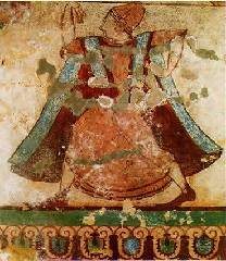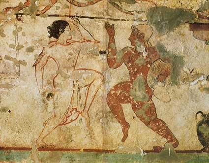 Al centro della parete di fondo, sopra lo stipo per il defunto, sono raffigurate due danze diverse: a sinistra un’elegante danzatrice che si muove al ritmo della cetra con la mano destra compie un gesto apotropaico (oppure altra lettura sarebbe suona una nacchera), mentre a destra viene riprodotta una coppia formata da una donna e da un uomo che ballano al suono di un doppio flauto. Al centro della scena c’è un enorme cratere a volute decorato con una corona di foglie di edera o forse di vite, pianta sacra a Dioniso. La presenza di questo oggetto e di altre stoviglie suggeriscono che si sta assistendo ad un simposio.