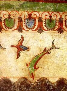 Nella porzione inferiore delle pareti vi è un fregio ad onda che rappresenta delfini, altro animale sacro a Dioniso, e uccelli.