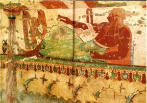 Infatti lungo le pareti laterali vengono raffigurati i partecipanti al banchetto: sono quattro uomini, distribuiti a coppie di due sulle due pareti, distesi sulle proprie klinai, uno ha nella mano l’uovo simbolo di rinascita. In particolare, sulla parete destra, l’uomo verso la parete di fondo impugna nella mano sinistra una kylix, una coppa da vino in ceramica.