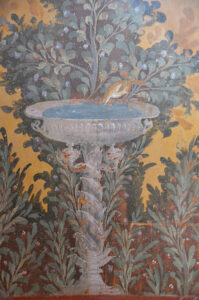 Di notevole interesse, anche il rinvenimento di alcuni frammenti di affresco, raffiguranti parte di un tripode dorato, iscritto in un oculus (cerchio), allo stesso modo della raffigurazione al centro di un’altra parete dove, invece, è rappresentato un tripode in bronzo.
