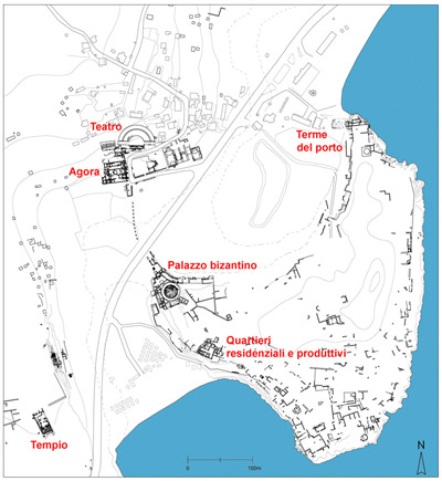 Nell’ultima campagna di scavo (agosto-ottobre 2012) alle indagini sul terreno, che hanno riguardato in particolare la chiesa episcopale della città, un impianto termale molto ben conservato e la torre-faro sul promontorio che segnava l’ingresso del porto Nord, si sono affiancate prospezioni subacquee condotte lungo la fascia costiera.