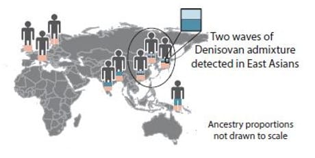 Le nuove analisi, che hanno richiesto il sequenziamento completo del genoma di 5600 soggetti che vivono in Europa, Asia, America e Oceania e il loro confronto con quello dell’uomo di Denisova, hanno però rilevato nelle popolazioni dell’Estremo oriente – in particolare nei giapponesi e nei cinesi Han e Dai – una seconda serie di tracce denisovane, differenti da quelle già individuate nei Papua.
