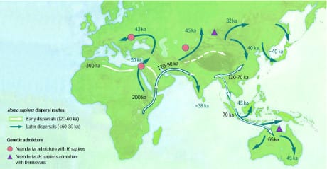 Una nuova revisione delle ricerche sulla diaspora degli esseri umani dall’Africa, pubblicata su “Science” da Christopher J. Bae dell’Università delle Hawaii a Manoa e colleghi, conferma ora che l’idea di un’unica ondata migratoria non può più essere sostenuta: lo scenario più plausibile descrive varie ondate migratorie susseguitesi a partire da 120.000 anni fa circa. La diaspora in Eurasia, inoltre, sarebbe stata caratterizzata da incroci con altre specie di ominidi.