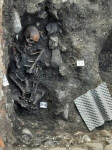 L’indagine intrapresa il mese scorso ha permesso di riportare in luce, fin dalla prima settimana, i resti di un edificio d’epoca rinascimentale (XIV – XV secolo), i cui limiti esatti non sono noti, ma del quale si sono individuati almeno quattro ambienti, uno dei quali conserva tracce di intonaco bianco alle pareti. Il cattivo stato di conservazione del deposito archeologico, compromesso da precedenti scassi per la posa dei sottoservizi, rende alquanto problematica l’interpretazione delle strutture. Delle murature originarie si conservano infatti solamente le fondazioni di 75-80 cm di spessore, costituite da pietre e grandi ciottoli legati da malta.