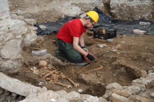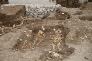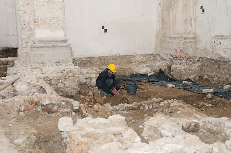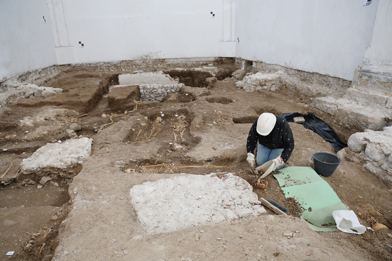 Le attività di scavo hanno interessato, in particolare, l’area dell’abside e del transetto, dove sono emerse strutture sepolcrali e murarie di notevole interesse. Alcune evidenze sembrano riferibili a fasi anteriori rispetto agli attuali assetti architettonici della chiesa, confermando la complessità delle trasformazioni avvenute nel corso dei secoli. Sono state individuate tombe ossario, sepolture a fossa semplice e resti ossei non sempre in connessione anatomica. La presenza di sepolture collettive, deposizioni individuali e resti rimaneggiati testimonia l’uso funerario prolungato dell’area e la sovrapposizione di più momenti di vita, trasformazione e riuso dello spazio sacro. La piena interpretazione dei ritrovamenti richiederà il proseguimento delle indagini ed il contributo coordinato di archeologi, antropologi, storici e archivisti. Lo studio dei resti umani potrà fornire informazioni sulle caratteristiche biologiche degli individui sepolti, mentre le ricerche archivistiche potranno contribuire a ricostruire il contesto sociale, religioso ed urbano legato alla chiesa, al convento e alle confraternite.