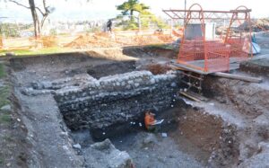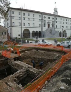 Foto dello scavo archeologico sulla cima del colle di Udine (dicembre 2021). L’alternanza di ghiaie e terra di colore arancio in primo piano corrisponde al riporto di epoca protostorica, su cui poggiano le mura medievali e rinascimentali. Sullo sfondo la sottostante Piazza I Maggio;