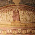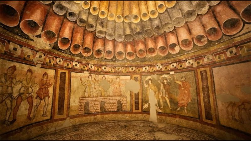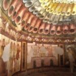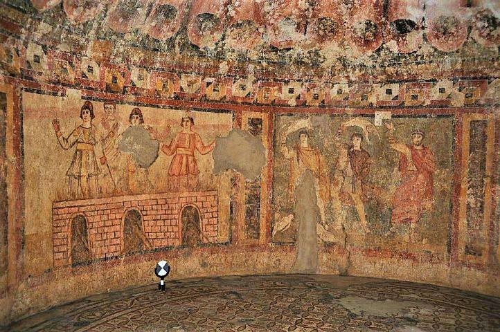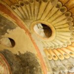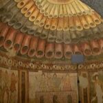 Particolarmente originale l’affresco della semicupola, dove sono raffigurati delle serie concentriche di cilindri di diverse cromie, forse a richiamare i rotoli della Legge delle Sacre Scritture oppure a voler fingere che la struttura muraria sia stata realizzata con la tecnica dei tubi fittili in terracotta.