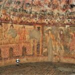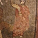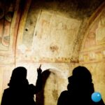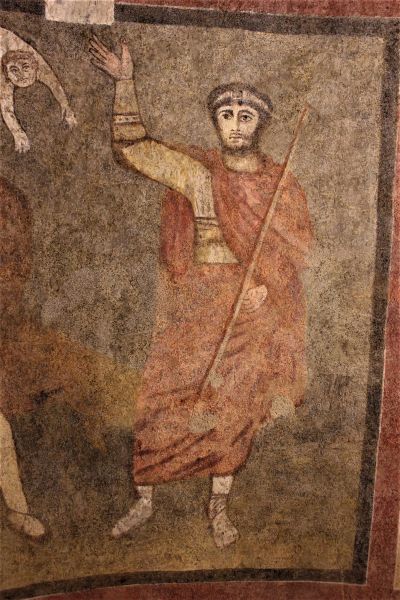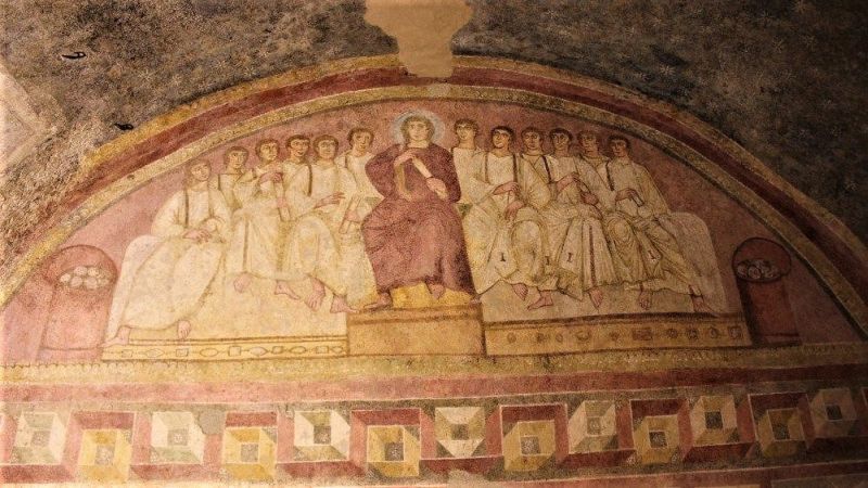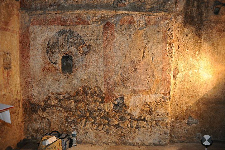 Quasi completamente conservate sono le pitture dell’aula sinistra, la cui iconografia, con rappresentazioni dell’Antico e Nuovo Testamento riprodotte tra due fasce orizzontali rosse e separate da finte lesene, ha fatto ipotizzare che si trattasse di uno spazio di catechesi e preparazione al battesimo.