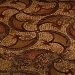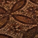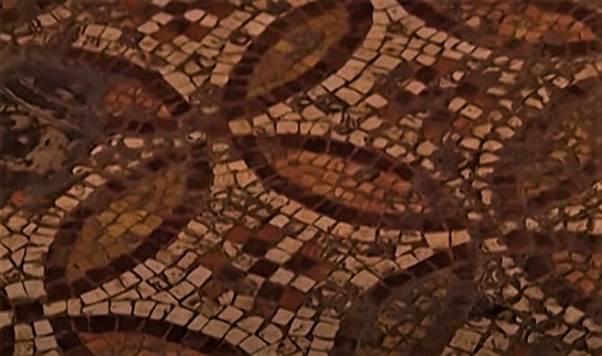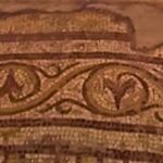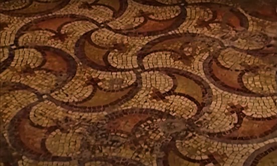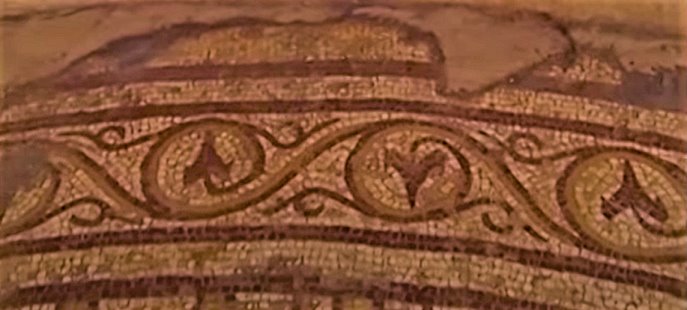 Il mosaico pavimentale dell’aula di destra si è mal conservato mentre quello nell’aula di sinistra è sostanzialmente integro, risultando perfettamente leggibili sia i motivi a croce floreale e a pelte rosso scuri con contorno nero e la cornice a girali di foglie di vite sulle tessere bianche di sfondo.