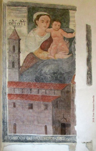 All’interno, sulla destra del portale principale dell’edificio vi è la raffigurazione di una bella donna seduta, dall’espressione serena e dalle sembianze meridionali, in abito non propriamente aristocratico, ma con un richiamo all’ambiente domestico: un modesto copricapo bianco, una mantellina bianca che copre la spalla destra, un vestito color porpora e un mantello blu rigonfio, sorretto dalla mano sinistra di un bambino nudo che porta in braccio; è seduta su un trono, del quale si scorge lo schienale molto sommario e in verde scuro.
